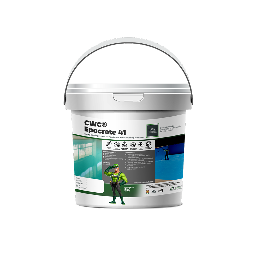 CWC®SMART EPOCRETE 41 is a two-component solvent free epoxy resin system, comprising pigmented base and a hardener, specifically formulated to protect concrete and steel. On mixing of the two components, it yields a high build, chemical resistant protective coating, which cures to a semi glossy, ultra-dense surface that is easily cleaned, hygienic and safe for contact with foodstuff and potable water, water canals etc.
