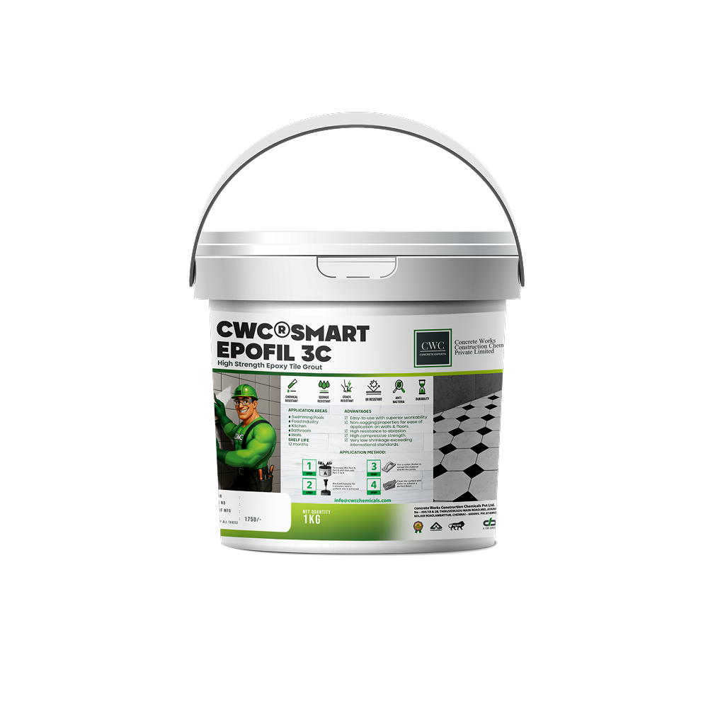 Epoxy resin-based tile joint grout shall be CWC®SMART EPOFIL having excellent mechanical properties and shall exceed compressive strength of 50 MPa, flexural strength of 30 MPa, and shall have pull-off adhesion strength exceeding 1.5 MPa.The formulation is water miscible to avoid stains on the tiles and ease cleaning.