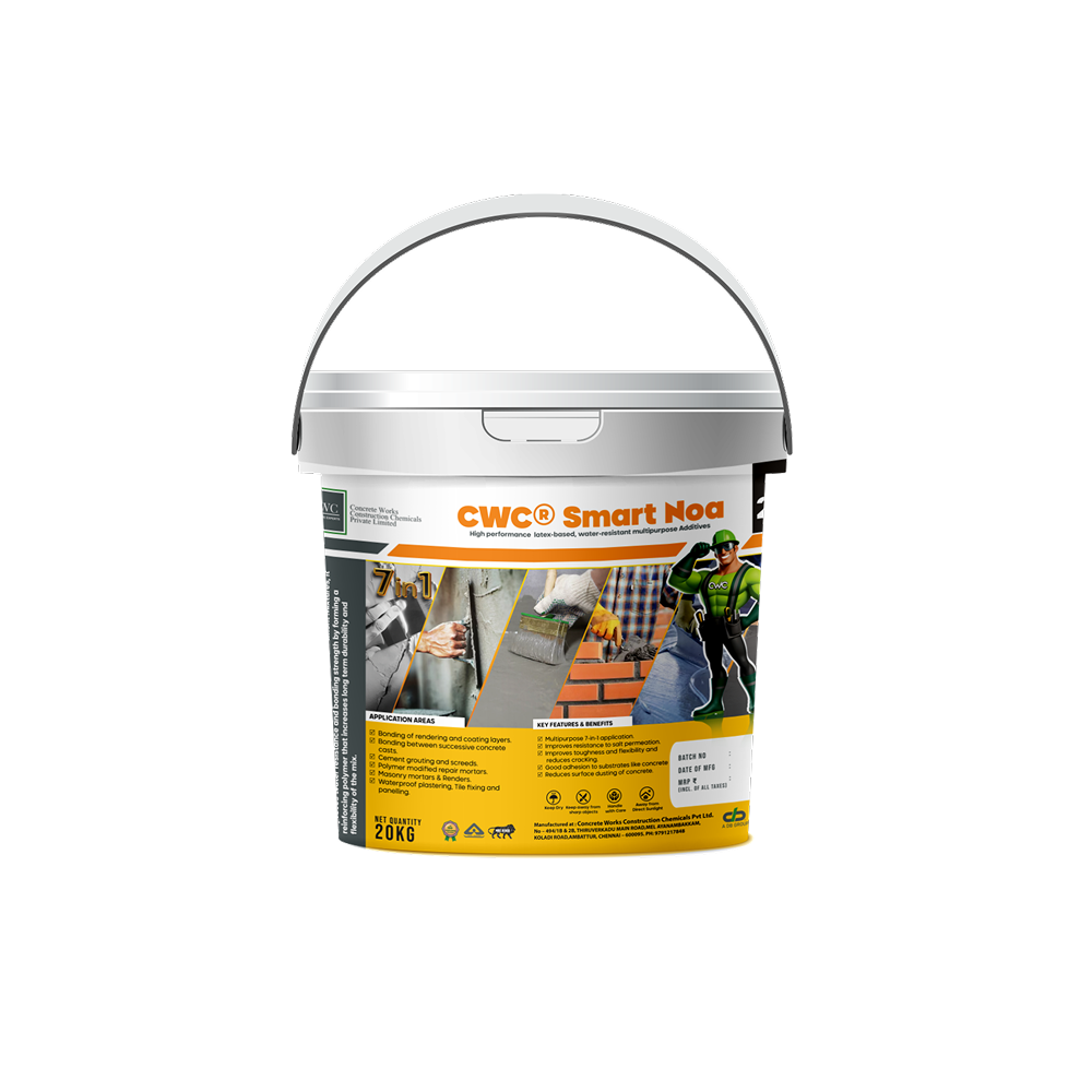 CWC ® SMART NOA is a latex-based, water-resistant multipurpose admixture for use in areas subject to humidity, dampness and continuous water contact. When added to cement mixtures, it improves water resistance and bonding strength by forming a reinforcing polymer that increases long term durability and flexibility of the mix.